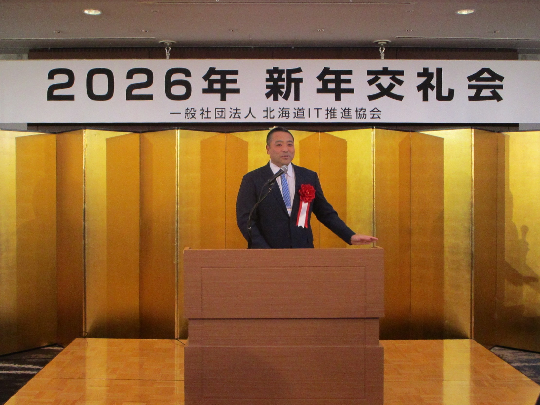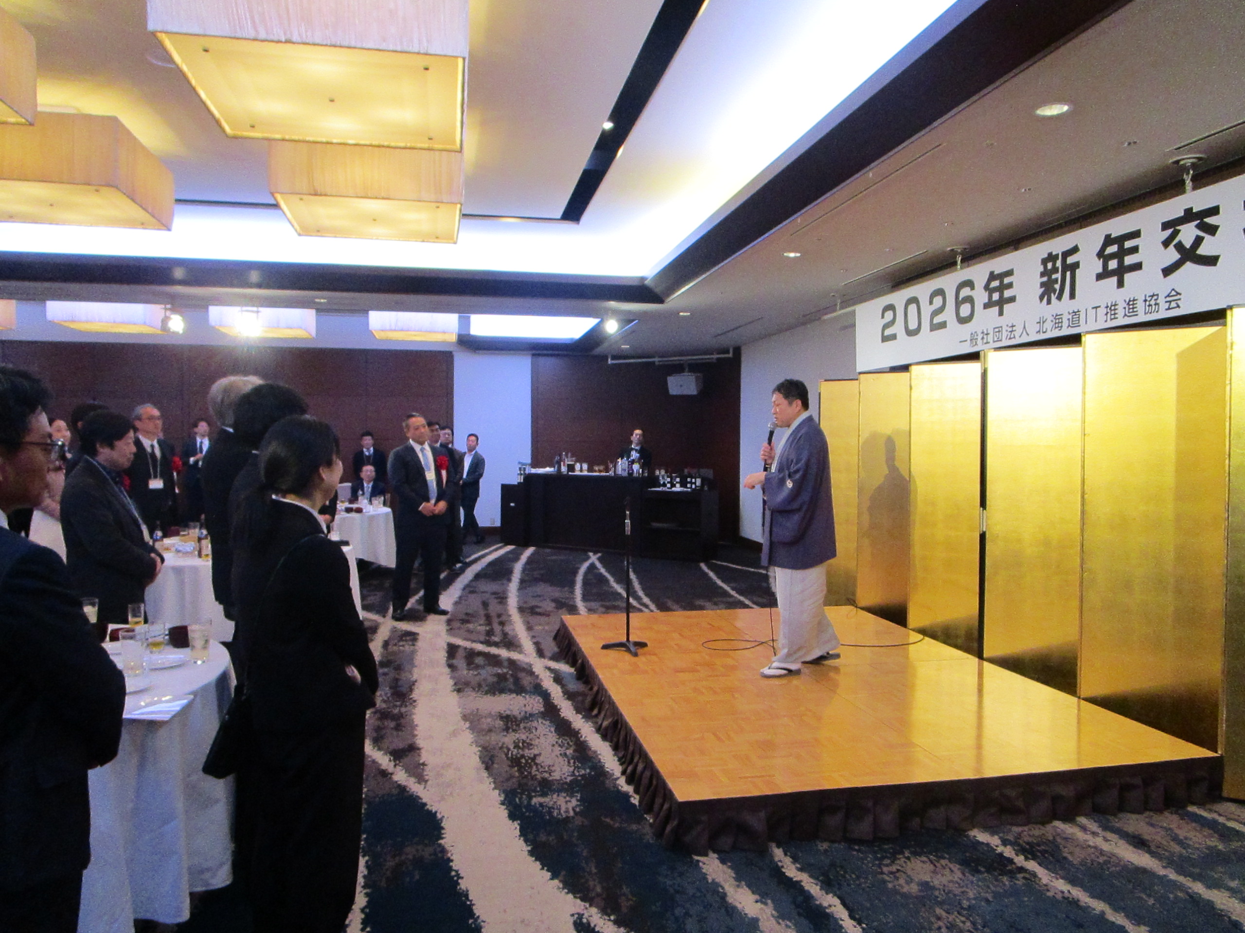 最初に、入澤会長から2024年度の道内IT産業の売上高は5,744億円、2025年度は6,019億円の見込み。2020年から1,000億円増えており、IT業界が成長していることが数字でもうかがえる。AIの脅威やサイバーセキュリティに対する危機感もあるが、様々な企業が集まっているこの場で情報交換し、会員の皆さんが切磋琢磨しながら業界を盛り上げて行こうという力強い挨拶の後、渡邉北海道経済産業局地域経済部長、和久屋北海道総合通信局長、大矢北海道経済部次世代社会戦略監、加藤札幌市副市長からご祝辞をいただき、北海道大学山本名誉教授の乾杯で交流をスタートしました。新規入会企業の紹介などの後、新春特別講演会で講演いただいた三代目 林家菊丸 師匠に小噺も披露いただき、皆さん大いに楽しんでおられました。